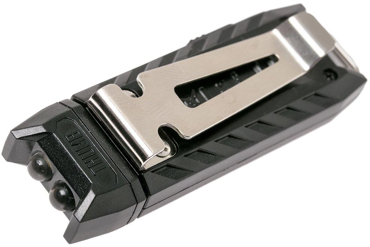 Die Nitecore Thumb LEO ist eine kleine Schlüsselanhänger-Leuchte für die Polizei. Der Lampenkopf ist schwenkbar und ermöglicht zusammen mit dem Taschenclip das Aufhängen z.B. an der Brusttasche. So hast Du Deine Hände für andere Tätigkeiten frei. Der rote und blaue Blinkmodus macht Dich gut sichtbar. Um das Bild zu vervollständigen, ist im Lampenkopf auch eine UV-LED installiert. Damit kannst du Spuren oder Falschgeld kontrollieren. Der UV-Strahl hat eine Wellenlänge von 365nm und eine Leistung von bis zu 500mW. An der Seite befinden sich zwei Schalter: einer für das rot-blaue Signallicht und einer für die weiße LED und die UV-LED.